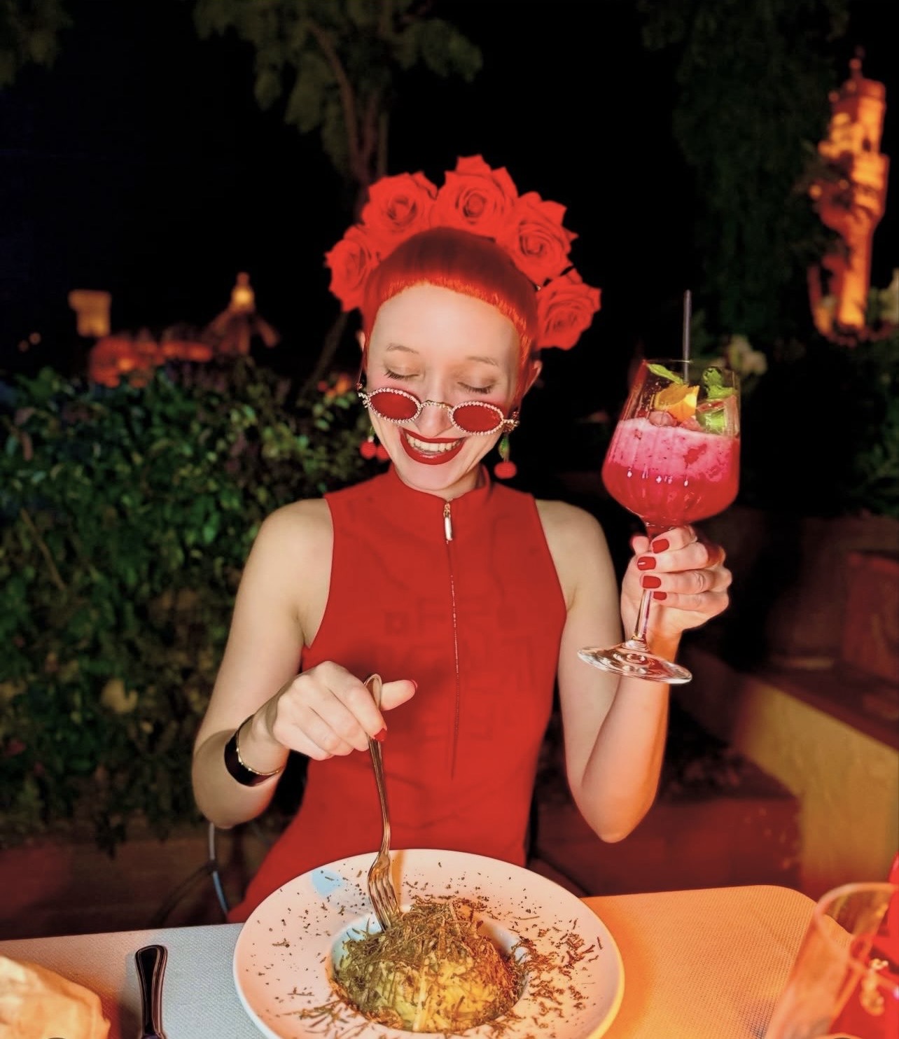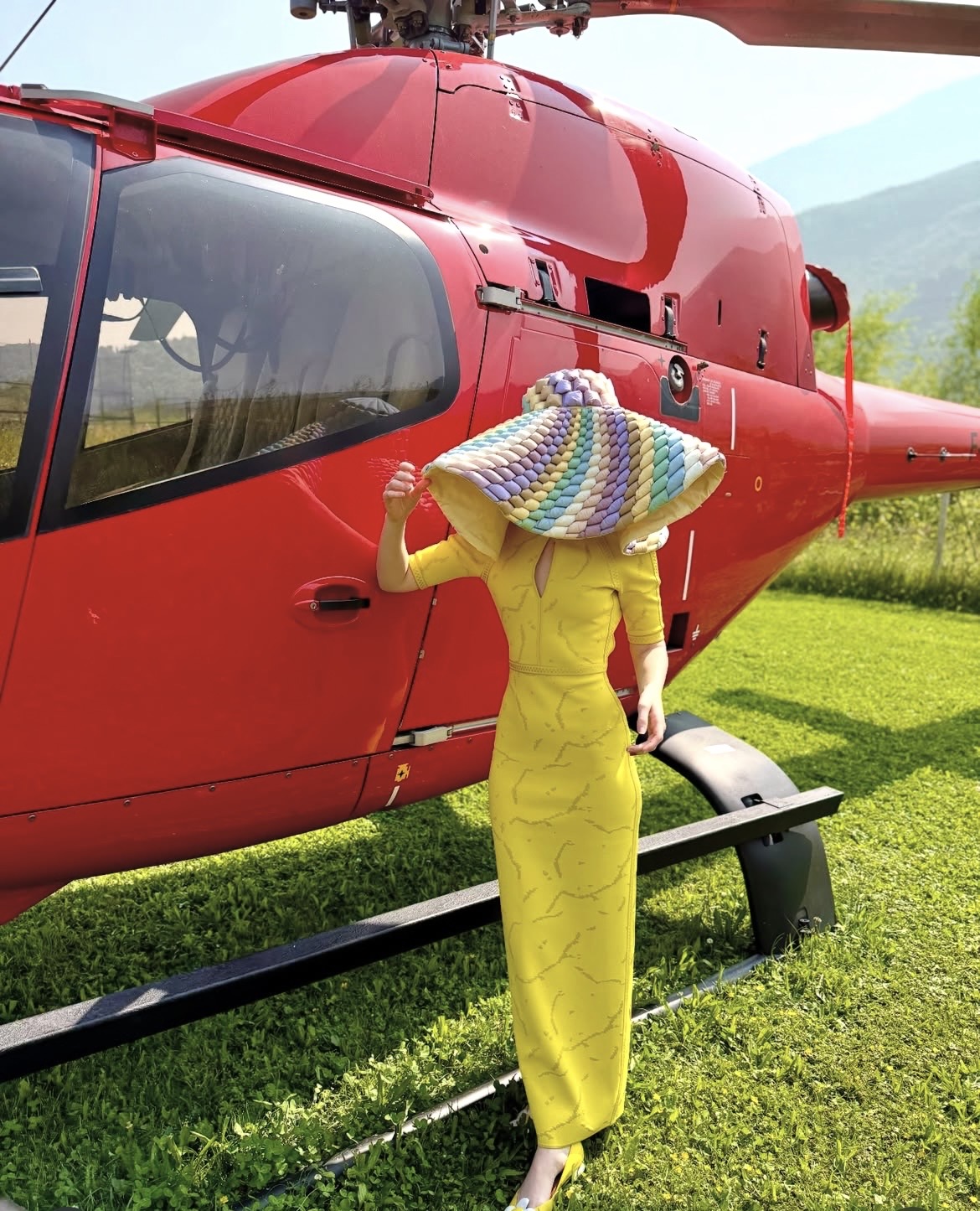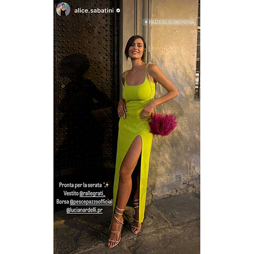Alice wears a Rallegrati yellow long dress with a sexy front slit