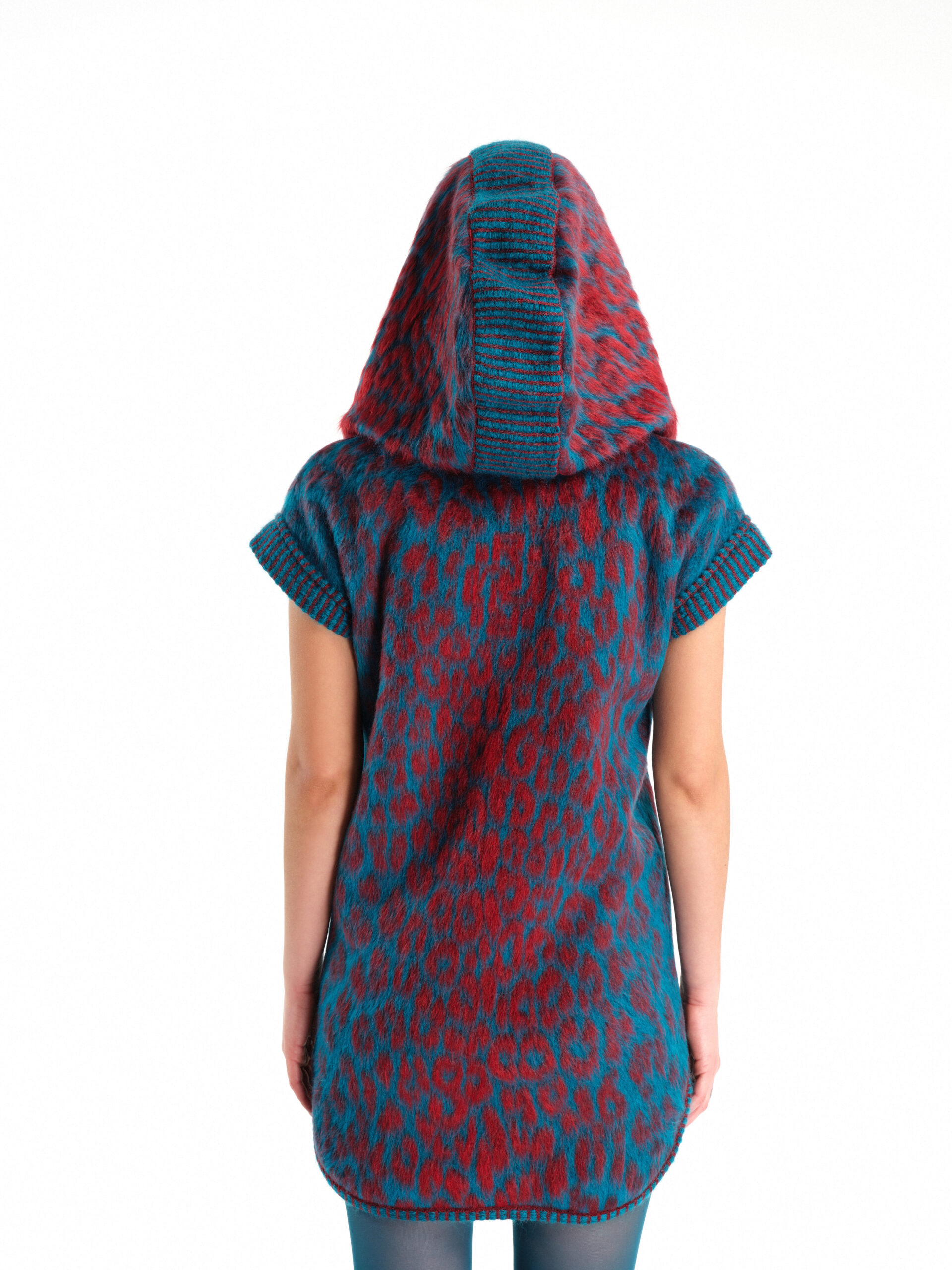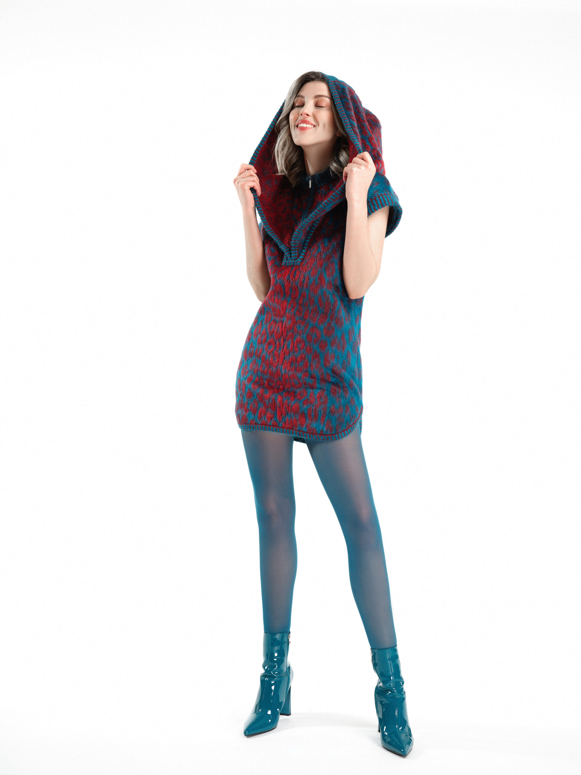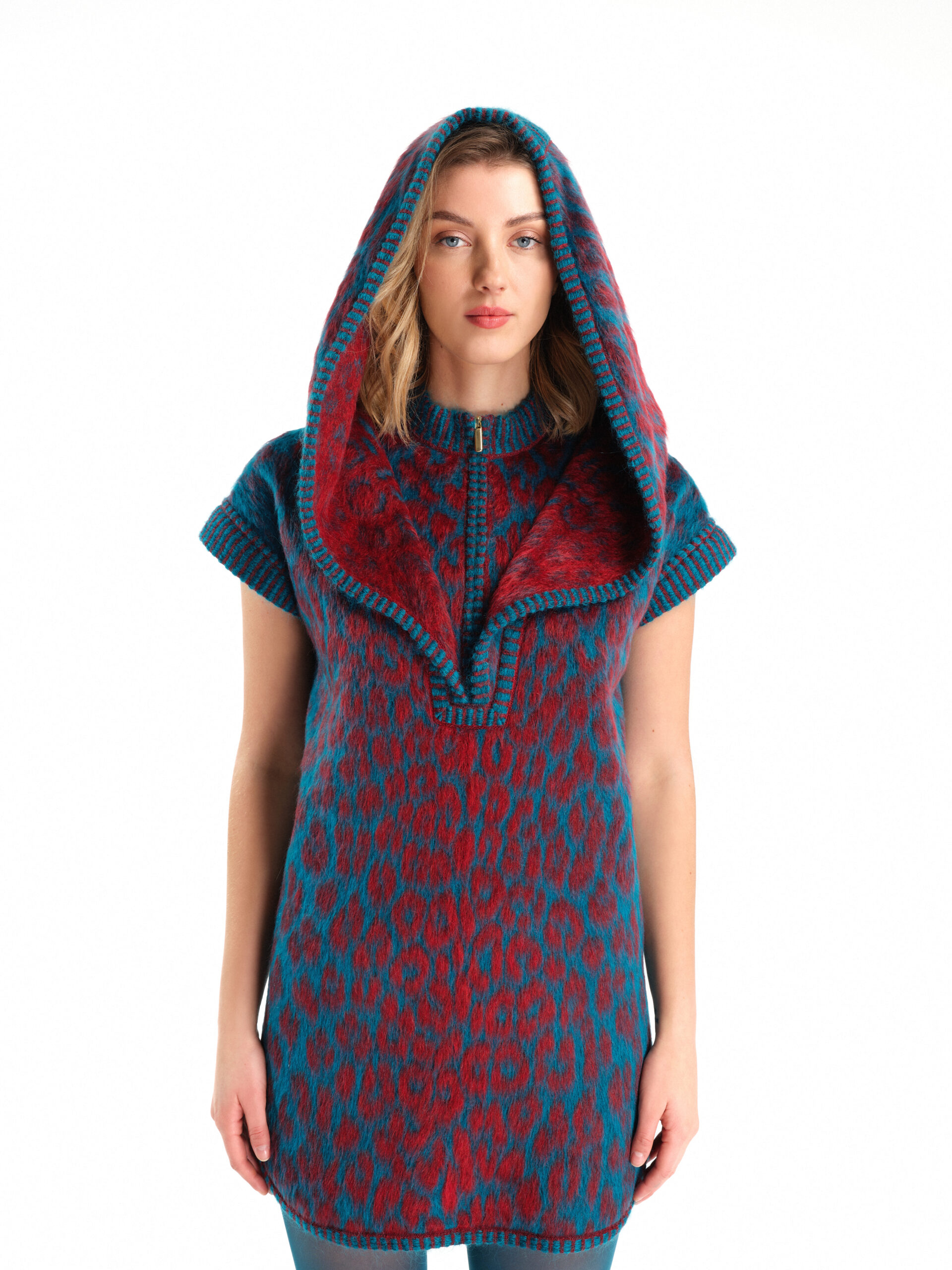 Abito in Mohair stretch indeformabile dalla texture effetto pelliccia. Fantasia Jacquard maculato in combinazione di colori vivaci e ampio cappuccio.
