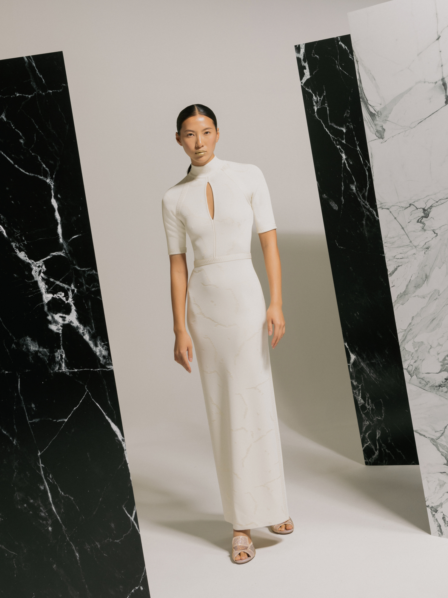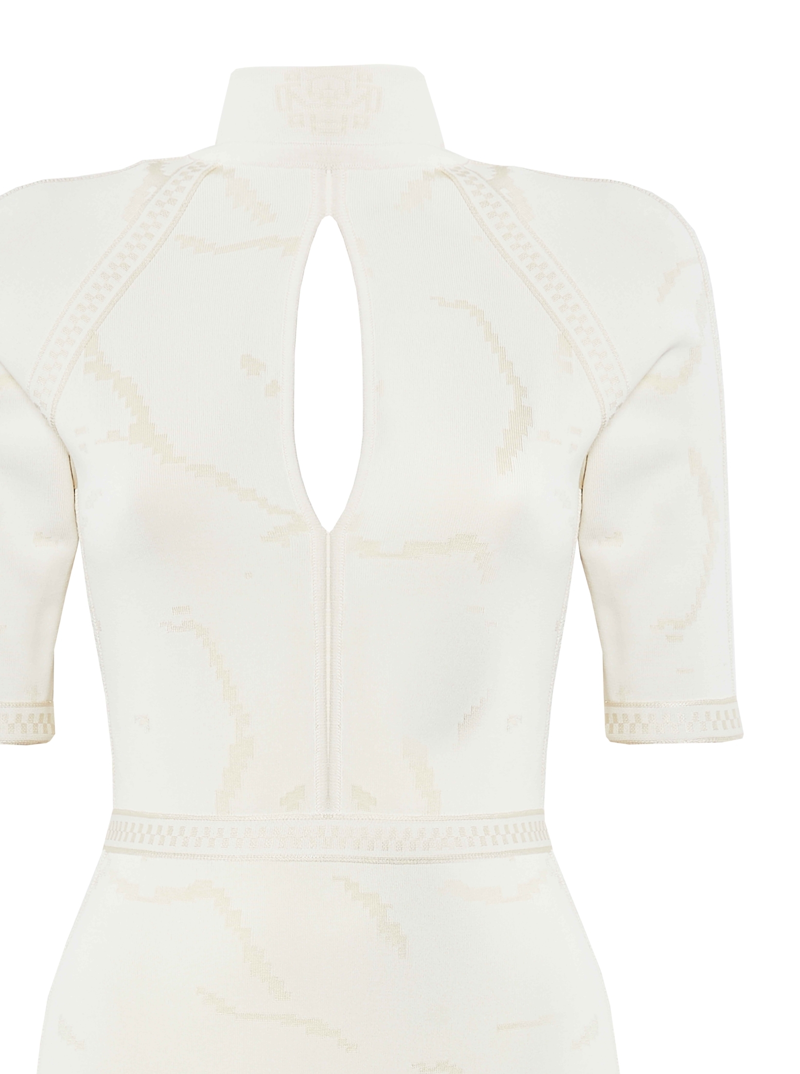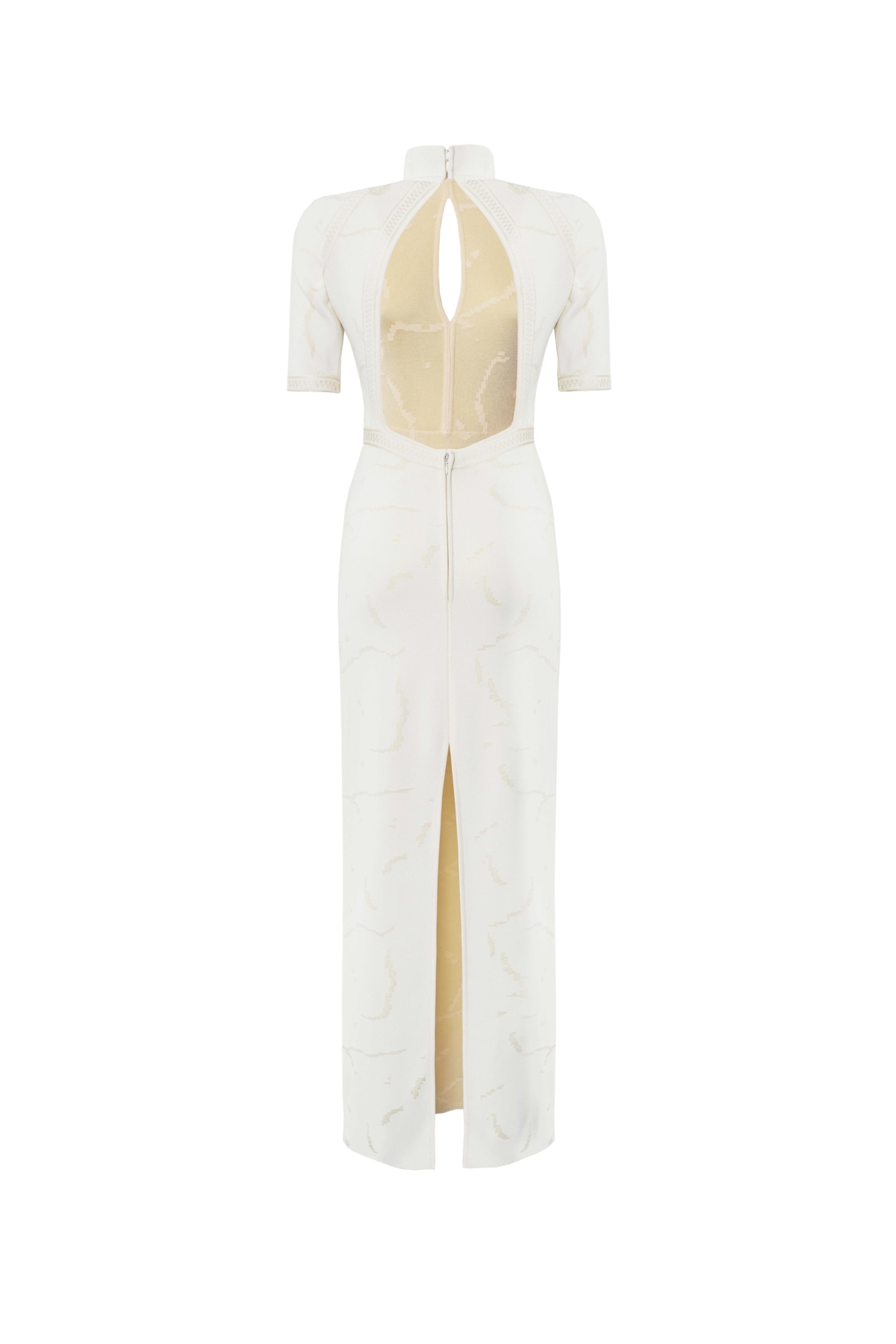 Abito lungo in pregiata maglia di viscosa stretch indeformabile con apertura su schiena. Fantasia Cracklè in jacquard tono su tono. Vestibilità slim.