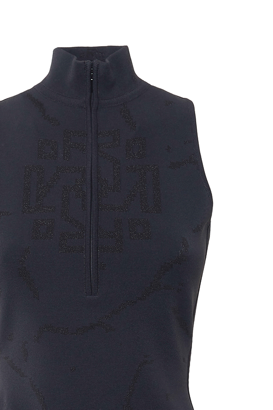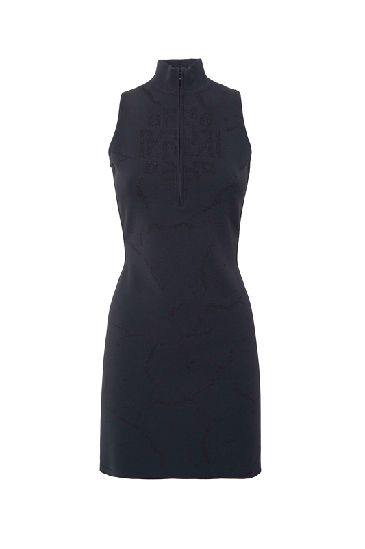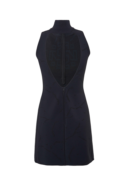 Miniabito in maglia di viscosa stretch indeformabile e contenitiva con zip frontale, collo alto e schiena scoperta. Fantasia jacquard tono su tono lamé. Vestibilità slim.