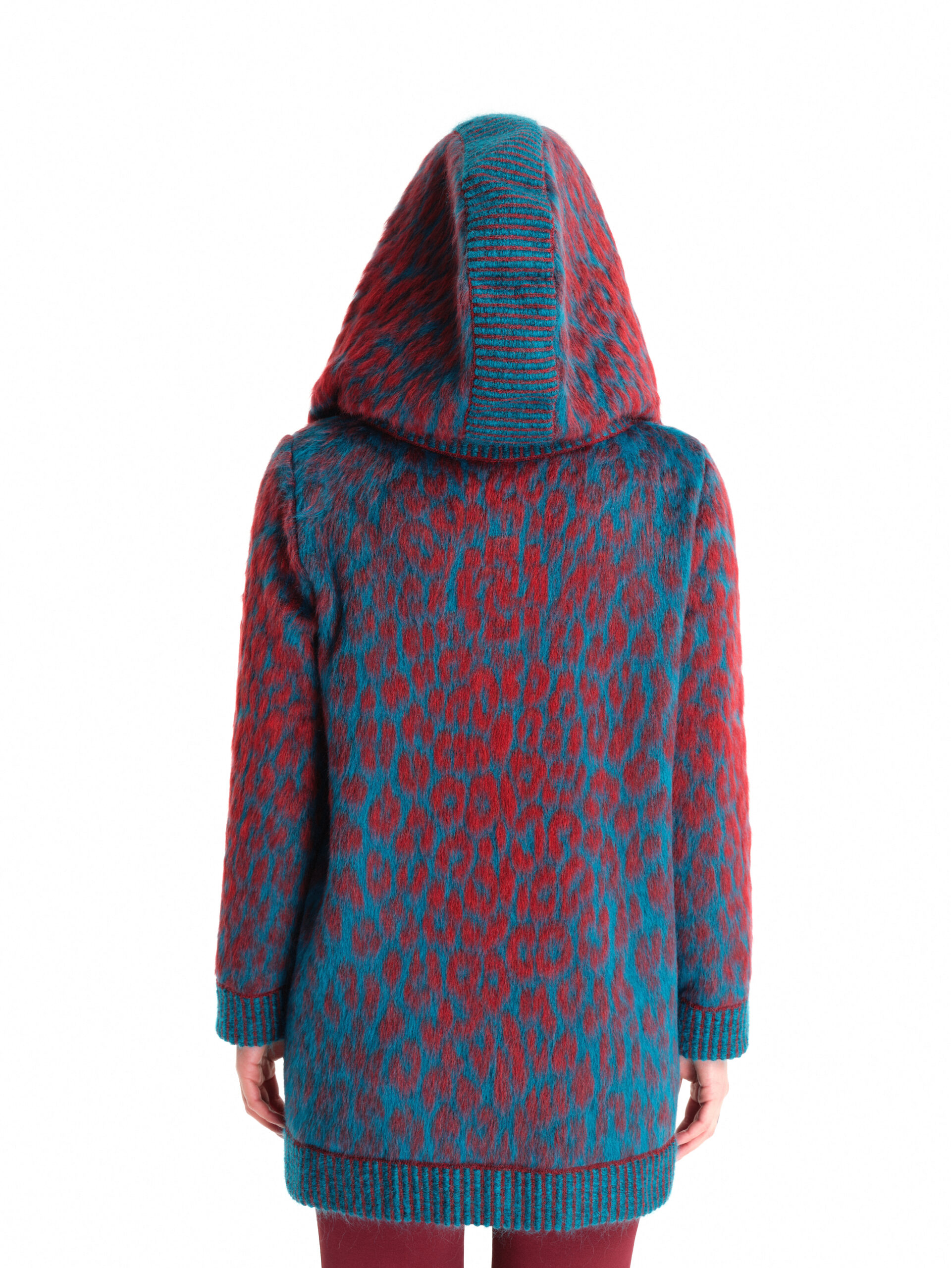 Cappotto con ampio cappuccio, realizzato in maglia Moahir superkid indeformabile, con Jacquard fantasia animalier effetto pelliccia. Altamente performante anche con le temperature più rigide.
