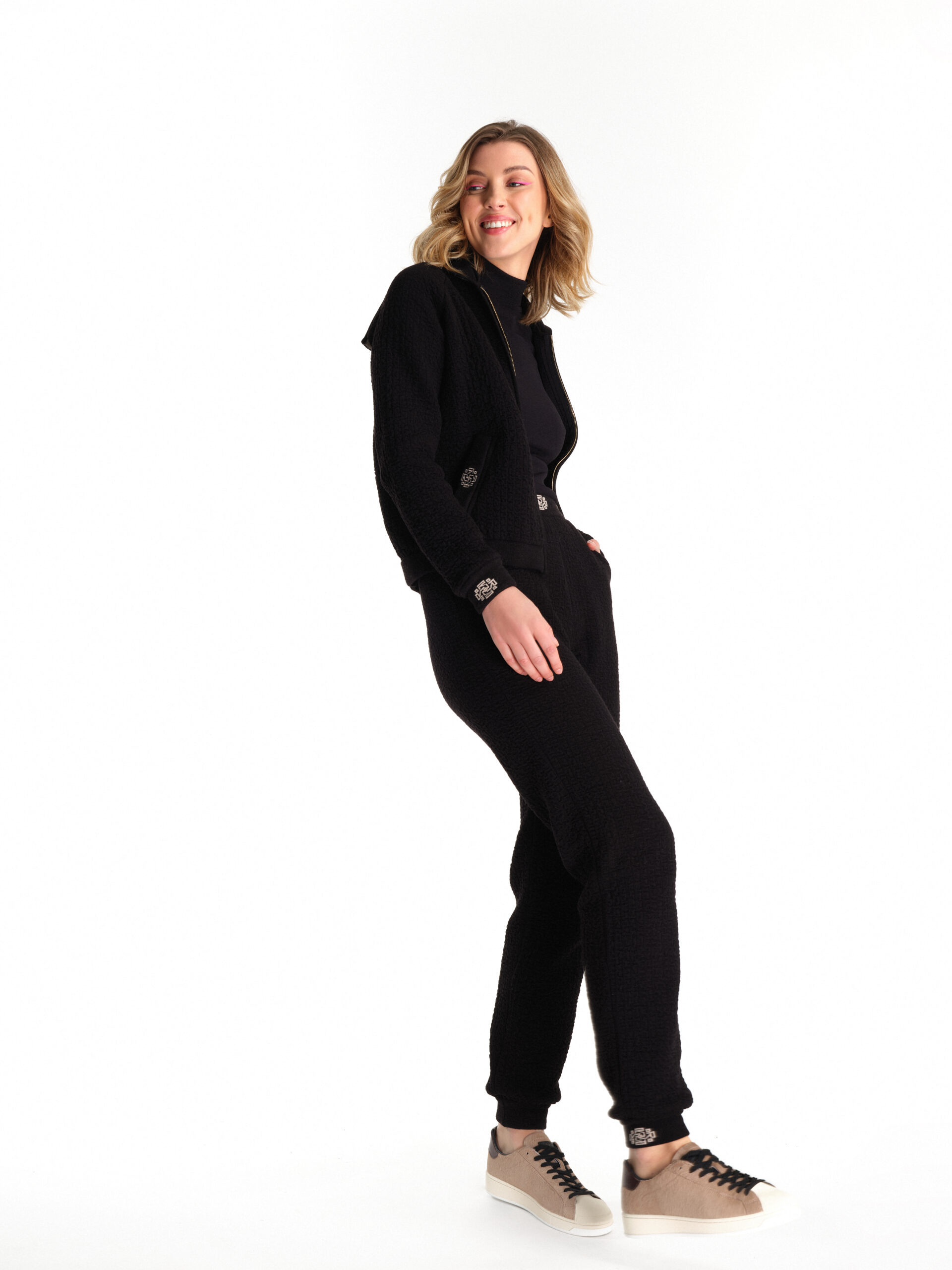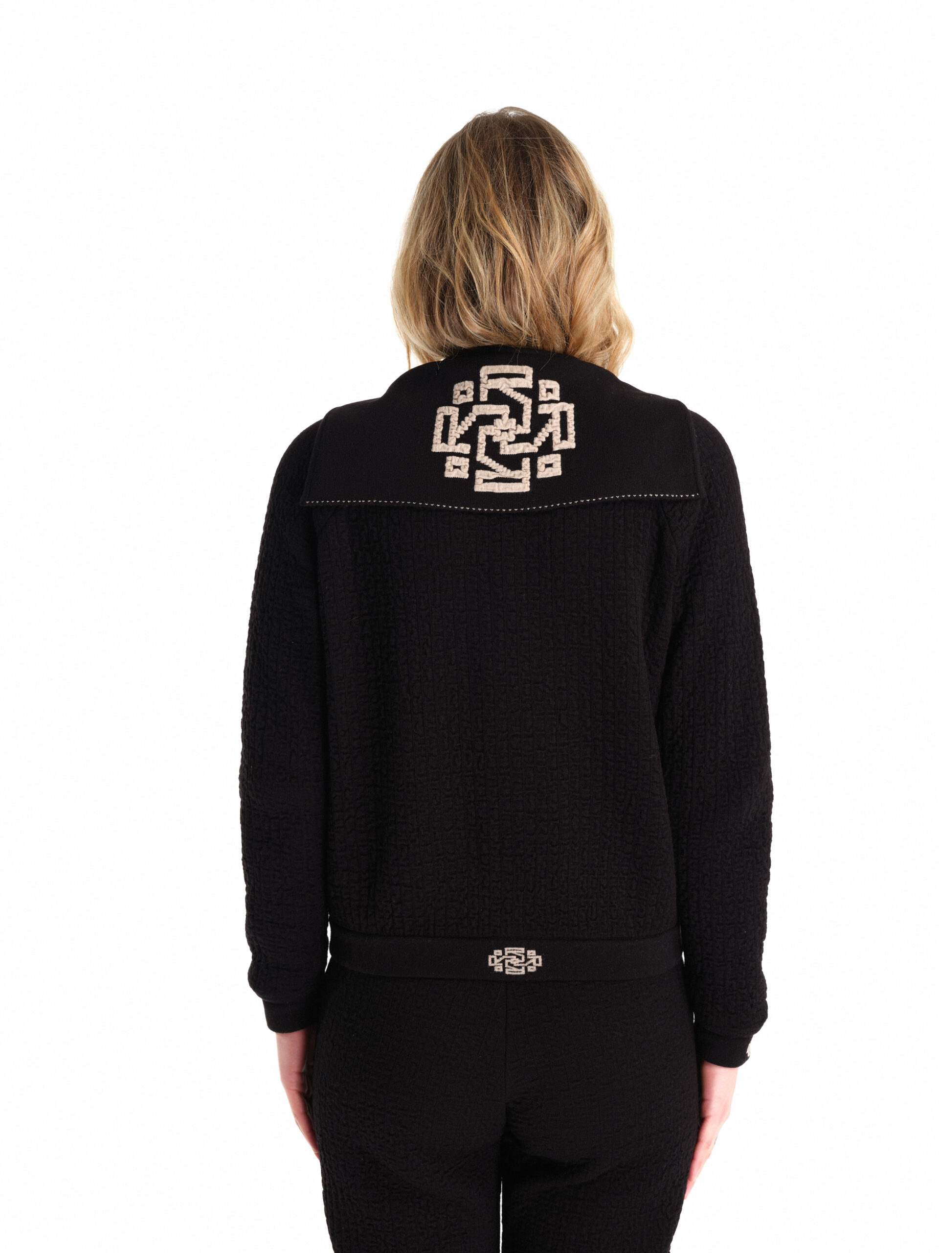 Giacca in maglia di cotone, indeformabile e duraturo. Jacquard in punto Murgia. Morbida e confortevole al tatto. Manica raglan, vestibilità standard.