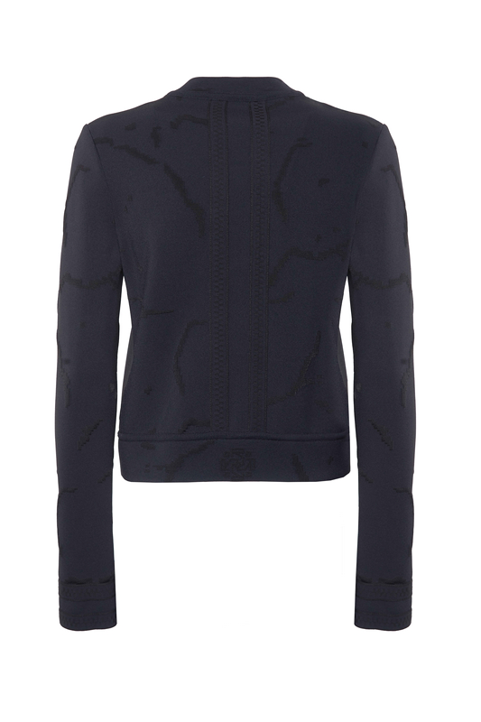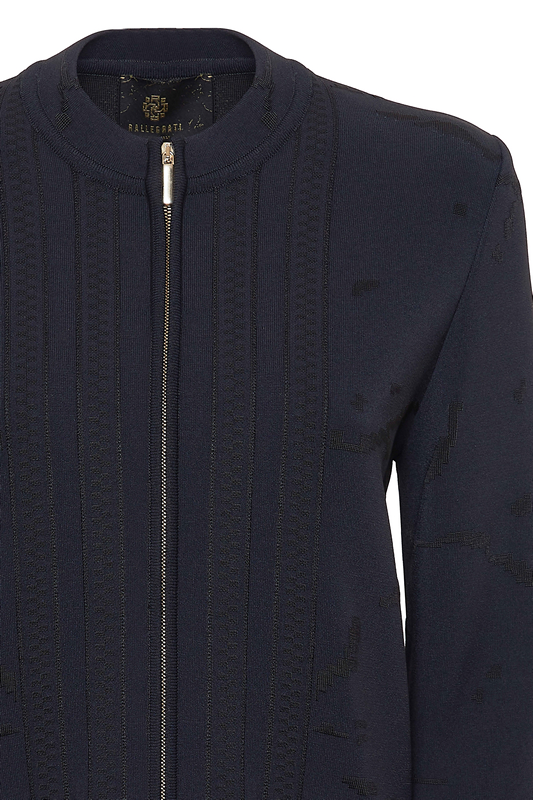 Giacca modello chiodo in pregiata maglia di viscosa stretch indeformabile. Inserti fantasia a scacchi jacquard tono su tono. Vestibilità standard.