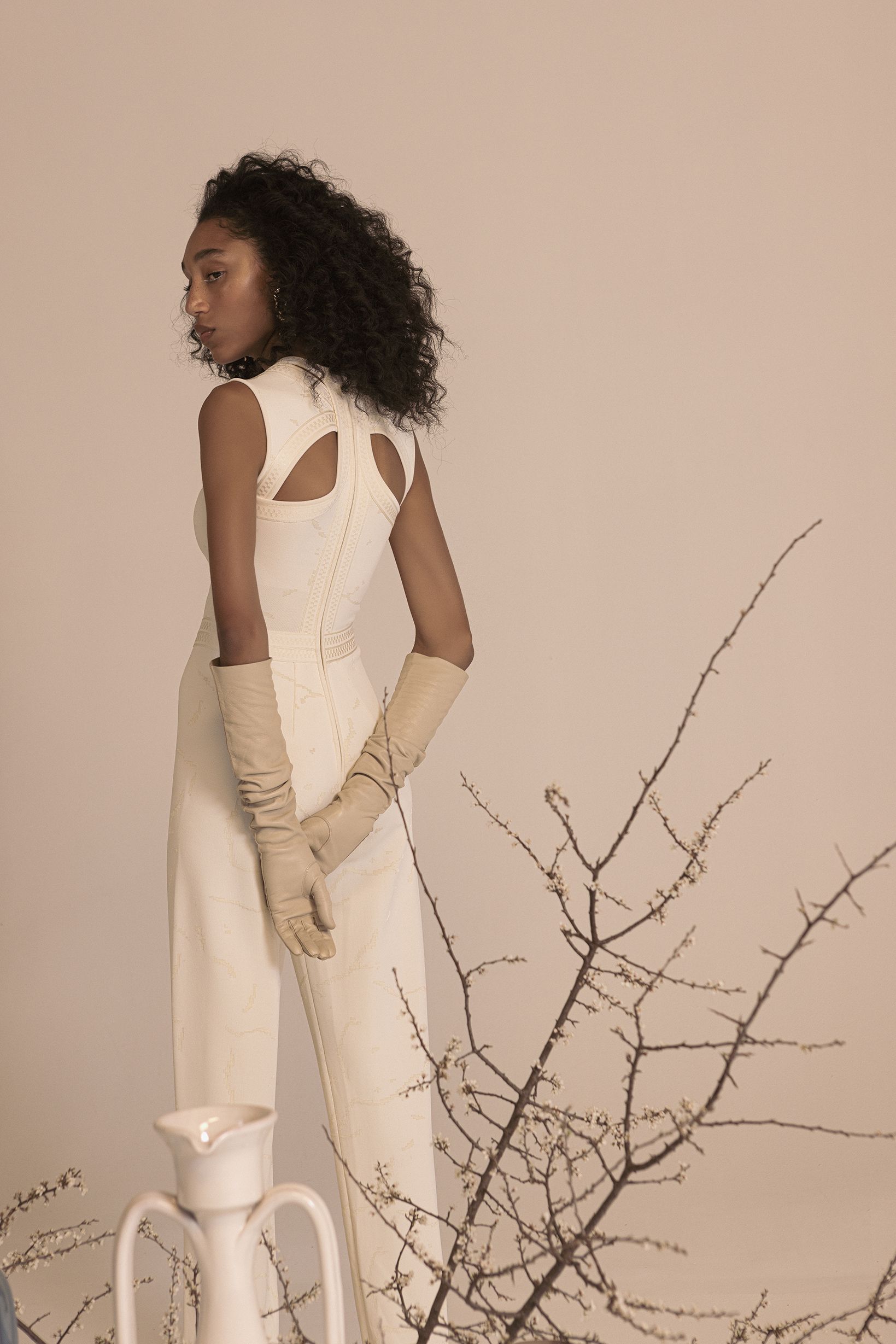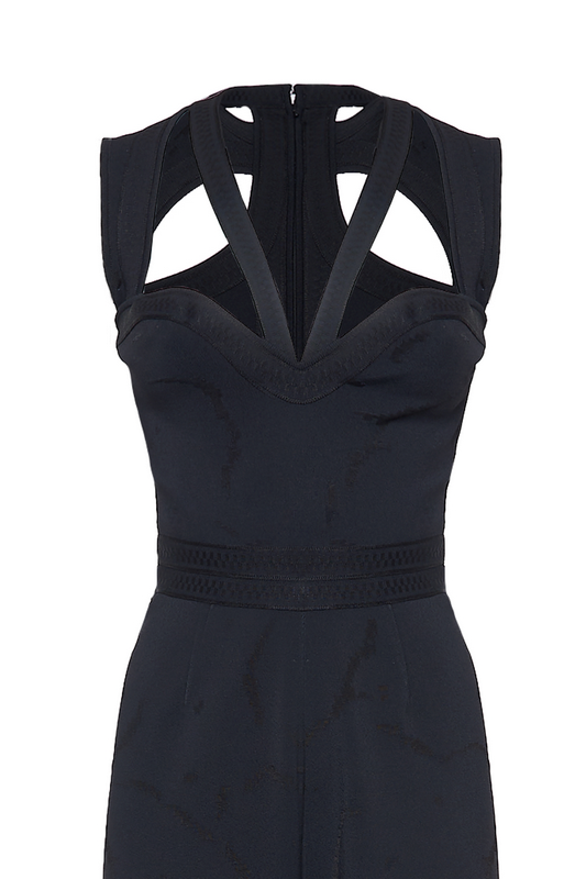 Tuta in pregiata maglia di viscosa stretch indeformabile con top cut-out a corsetto con scollo a cuore. Fantasia Cracklè in jacquard tono su tono. Vestibilità slim.