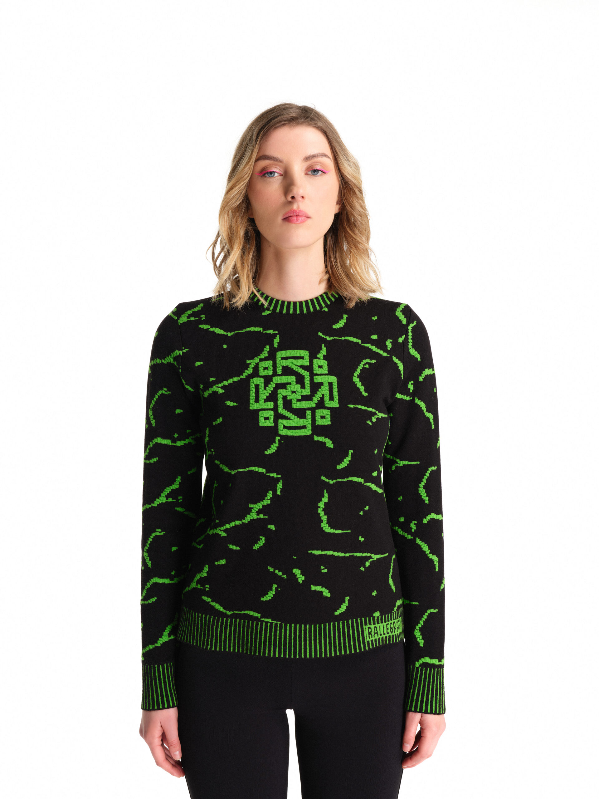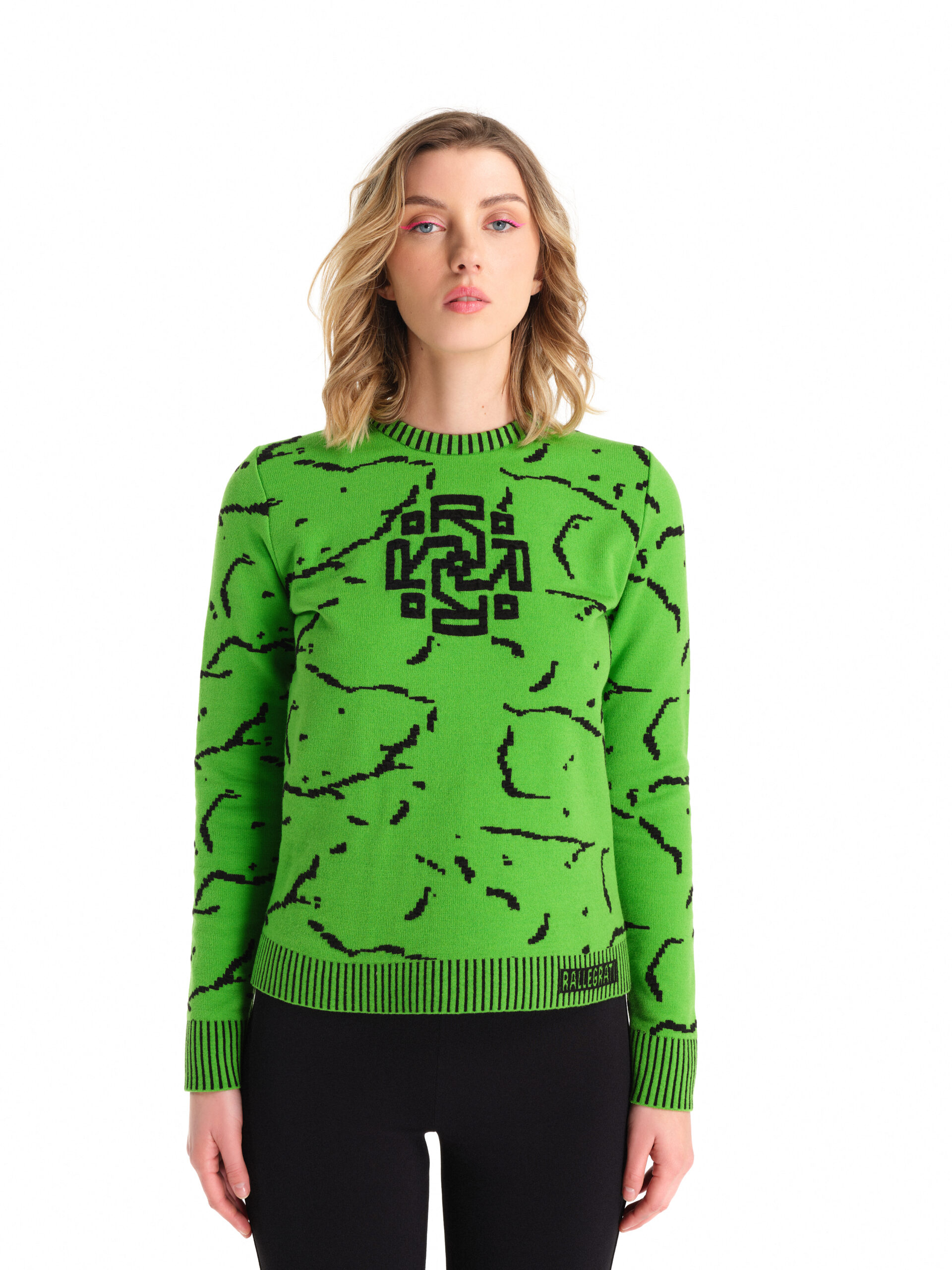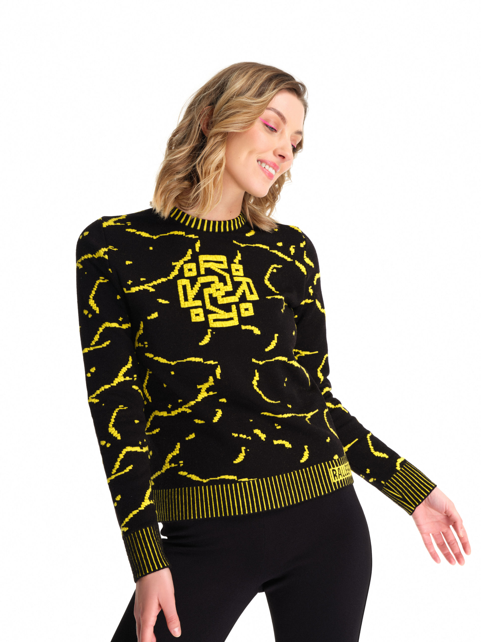 Pullover in lana Merinos stretch indeformabile in fantasia Cracklè Rallegrati, logo frontale e coste bicolor in tre versioni/colori.